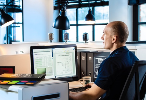 Ein Mitarbeiter unseres Verkaufsinnendienstes nimmt den Auftrag zur neuen Farbeinstellung entgegen. Anschließend wird in Abstimmung mit dem Außendienst und Kunden ein Laborauftrag angelegt.