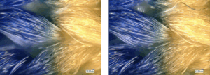 Aufnahmen von Fasern in 500-facher Vergrößerung. Links: normale Aufnahme, rechts: tiefenscharfes Bild.